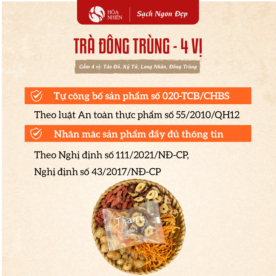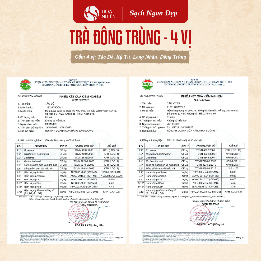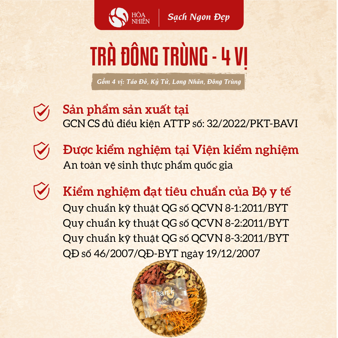 Kỷ Tử đỏ (Hạt Kỳ Tử đỏ), Câu Kỷ Tử pha trà thảo mộc với Táo Đỏ, Long Nhãn, Hoa Cúc Chi - Hòa Nhiên được sản xuất bởi thương hiệu Hòa Nhiên (hộ kinh doanh Cửa hàng Bản Sướng). Sản phẩm được sản xuất tại cơ sở có chứng nhận an toàn thực phẩm. Táo Đỏ Tân Cương sấy khô; Táo đỏ tân cương nguyên quả, Trà Táo đỏ cắt lát sấy giòn Hòa Nhiên được kiểm nghiệm tại Viện Vệ sinh An toàn Thực phẩm Quốc gia và đều đảm bảo các quy chuẩn của Bộ Y Tế đưa ra.