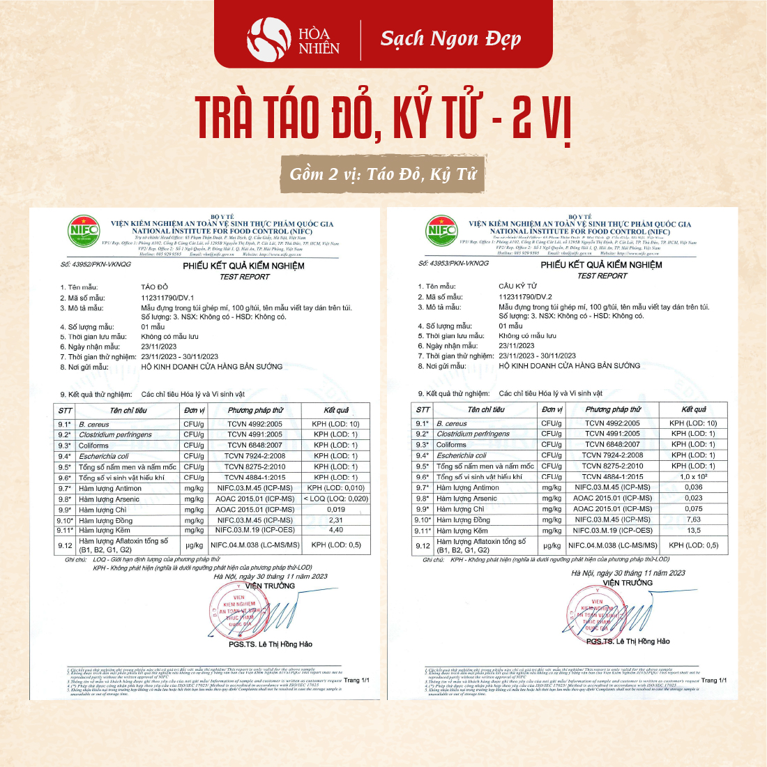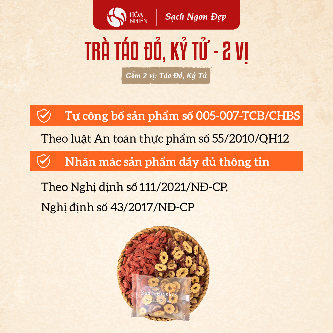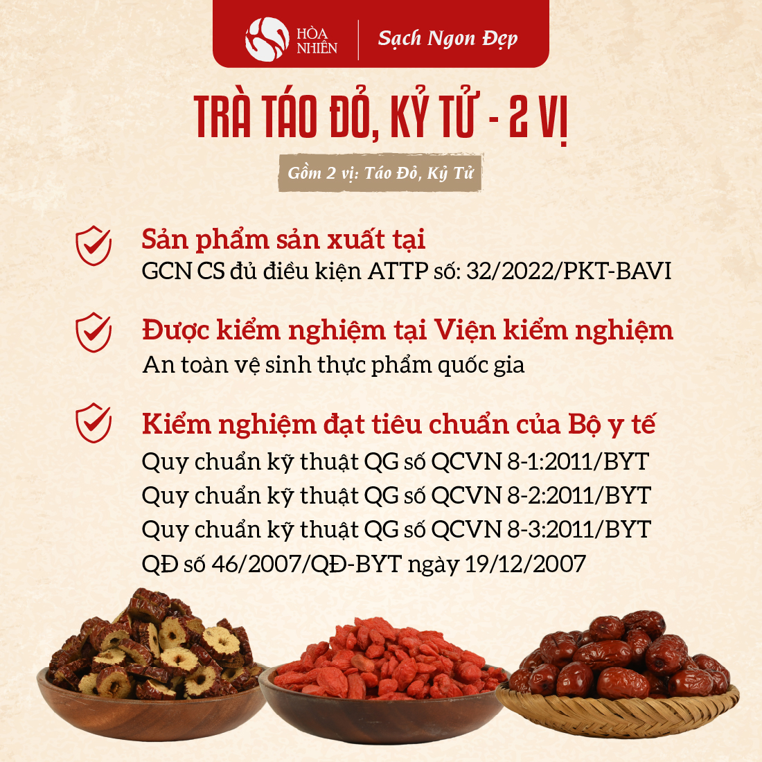 Kỷ Tử đỏ (Hạt Kỳ Tử đỏ), Câu Kỷ Tử pha trà thảo mộc với Táo Đỏ, Long Nhãn, Hoa Cúc Chi - Hòa Nhiên được sản xuất bởi thương hiệu Hòa Nhiên (hộ kinh doanh Cửa hàng Bản Sướng). Sản phẩm được sản xuất tại cơ sở có chứng nhận an toàn thực phẩm. Táo Đỏ Tân Cương sấy khô; Táo đỏ tân cương nguyên quả, Trà Táo đỏ cắt lát sấy giòn Hòa Nhiên được kiểm nghiệm tại Viện Vệ sinh An toàn Thực phẩm Quốc gia và đều đảm bảo các quy chuẩn của Bộ Y Tế đưa ra.